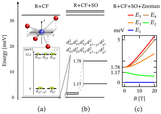 Low-lying energy level sequence for the trigonal bipyramidal coordination. The model parameters are given at the end of Section 2.1. (a) Shows CF splitting all repulsive Coulomb interactions accounted for. The orbital energy diagram and the corresponding electrons’ (circles) configuration resulting from CF is shown in the inset. (b) Depicts the spectrum with the contribution of spin–orbit interactions. (c) Shows the Zeeman splitting resulting from the action of the externally applied magnetic field.