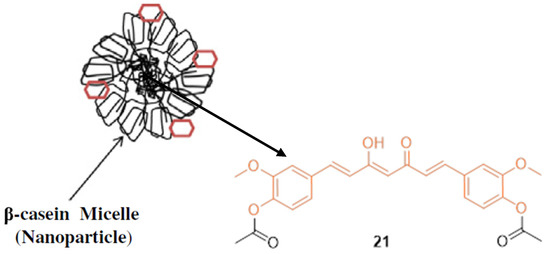 Basnet et al. reported that diacetylcurcumin 21 (DAC), a synthetic derivative of CUR, showed strong nitric oxide (NO) and O2− anion scavenger properties. However, this modification did not solve the basic problem of low aqueous solubility and poor bioavailability, which limits further studies [33]. Mehranfar et al. combined DAC with bovine casein nanoparticles (B-CNs) (Figure 3) to determine anti-cancer effects and improve bioavailability. DAC with Fe (III) is more stable due to increased basicity and additional anti-bacterial effects. In vitro anti-cancer studies performed on MCF-7 human breast cancer cells suggest the DAC-β-casein complex, creating a nanoformulation, displayed greater cytotoxic effects with an IC50 value of 22.5 µM compared to DAC (IC50 = 26.5 µM). The authors claim that B-CN micelles interact mainly via hydrophobic interactions that increase the solubility, bioavailability, and anti-tumor activity of DAC [34].
