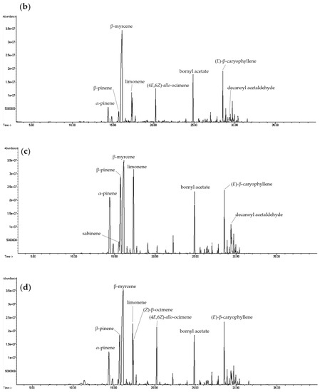 Comparing HS-SPME of fresh plants, HS-SPME of essential oil, and direct injection of essential oil, HS-SPME from fresh plants produced the smallest number of volatile compounds, followed by HS-SPME of essential oil, while direct injection of essential oil produced the most. Analysis of fresh plants by HS-SPME identified aliphatic alcohols and aliphatic aldehydes of low molecular weight, while analysis of essential oils by HS-SPME identified the highest content of monoterpenes. Direct injection of essential oils could identify more aliphatic ketones, sesquiterpenes, and terpene esters (Table 2).