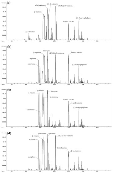 Ion chromatogram of volatile compounds in essential oil from different parts of fresh H. cordata analyzed by direct injection: (a) leaf; (b) stem; (c) rhizome; and (d) whole plant.