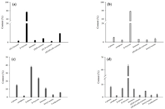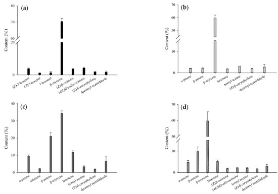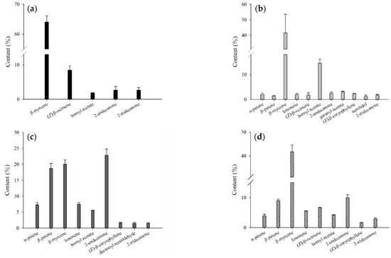 Comparison of the contents of the major volatile compounds in essential oil from different parts of fresh H. cordata analyzed by direct injection: (a) leaf; (b) stem; (c) rhizome; and (d) whole plant.