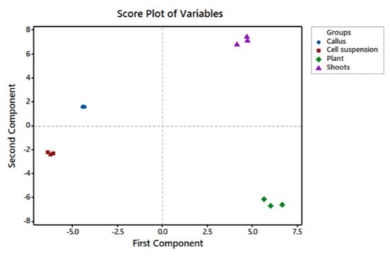 The content of several groups of metabolites, such as hydrocarbons, fatty alcohols, fatty acids, organic acids, saccharides, terpenes, phytosterols, and free and bound phenolic acids has been identified in biomass of G. jasminoides plant leaves and in vitro grown shoot, callus, and cell suspension cultures by GC/MS. In total, 67 metabolites were identified in the plant and shoots, and 41 and 34 metabolites in callus and cell suspension cultures, respectively (Figures S2–S5, Table S1). Principal component analysis (PCA) showed that four principal components have eigenvalues greater than one, explaining 97.6% of the variation in the data. Figure 1 shows the score plot of the first and second principal components. PC1 has an eigenvalue of 31.641 and explains 40.1% of the variations. It has strong positive associations with Octadecane, 2-methyl; Tetracosane; 1-Eicosanol; Galactose; Galactosylglycerol; Sucrose; Protocatechuic acid; Quinic acid; trans-p-Hydroxycinnamic acid; 3,5-Dimethoxy-4-hydroxycinnamic acid and trans-Ferulic acid. PC2 has an eigenvalue of 27.415 and explains 34.7% of the variations. It has strong positive associations with Dodecanol; Heptane, branched (Hydrocarbon); Tetradecanoic acid (methyl ester C14:0); Hexadecanoic acid (methyl ester, Palmitic acid, C16:0); Octadecadienoic acid (methyl ester, Linoleic acid, C18:2); Octadecenoic acid (methyl ester, Oleic acid, C18:1); 1-Docosanol; 1-Tetracosanol; Octacosane;1-Octacosanol; Erythritol and Fructose.
