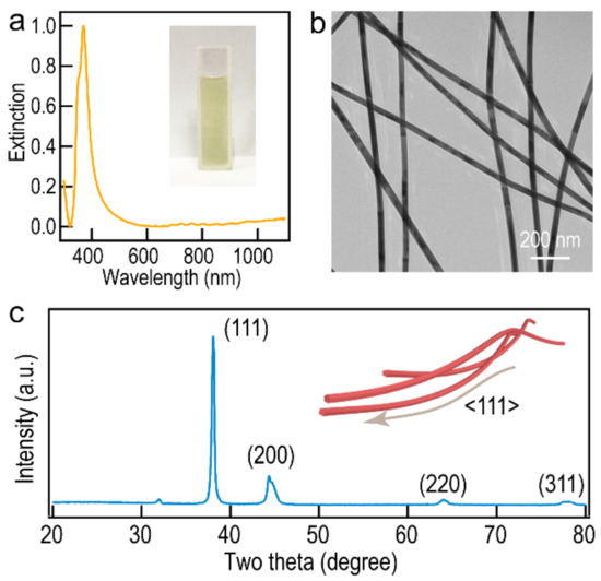 (a) Extinction spectrum of the purified Ag NWs. The inset is the photograph of the purified Ag NWs. (b) TEM image of the purified Ag NWs. (c) XRD pattern of purified Ag NWs. The inset is the model of Ag NWs.