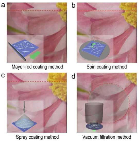 Photographs of Ag NW-based films prepared through (a) Mayer-rod coating, (b) spin coating, (c) spray coating, and (d) vacuum filtration methods. The inset is the corresponding diagrams of these four methods.