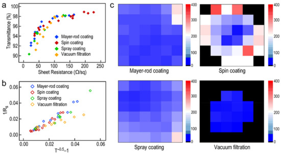 In general, sheet resistance and transparency are two key factors to estimate the optoelectronic properties of Ag NW-based films. Sheet resistance is an essential index relative to electronic conductivity, permittivity, and electromagnetic shielding efficiency for observing optoelectronic properties. Transparency also can reflect the optoelectronic property in the visible region to develop applications. The obtained films, especially spray coating and spin coating method fabricated ones, showed excellent transparency in the visible region (Figure S5). Figure 4a exhibits plots of transmittance versus sheet resistance of the Ag NW-based FTCFs fabricated through these four methods. These films show outstanding conductivity (from 10 to 200 Ω sq−1) and transmittance (from 90 to 98%). Only slight differences in these Ag NW-based films could be observed. In general, the transmittance and sheet resistance of a thin metallic film may be expressed as [51,52]: