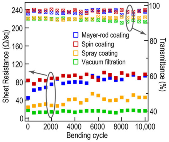 Sheet resistance and optical transmittance for the Ag NW/PMMA films by different methods after 10,000 bending cycles under 50% strain.