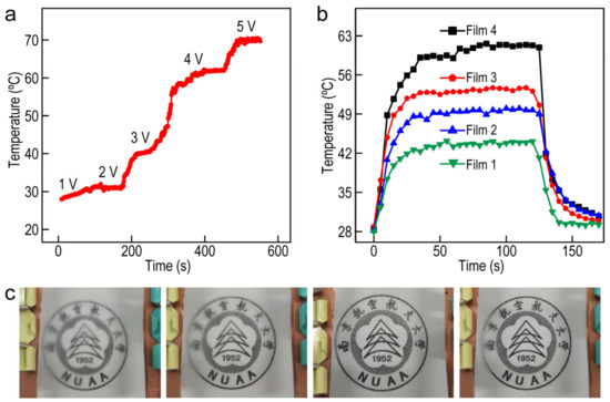 On the basis of the conductivity and stability of Ag NW/PMMA films, the Joule heating and defogging properties of the oriented Ag NW-based electrode were also studied. We selected the films prepared by spray coating for the following characterization experiment. Figure 6a presents the time-dependent temperatures at various applied voltage, while the voltage was increased by 1 V every 100 s until the heater failed at 6 V bias voltage. As the voltage increased from 1 to 5 V, the temperature of the films increased rapidly and reached a steady-state temperature within 50 s. The steady-state temperature of the film could reach 72.5 °C. The temperature–time curves of the films with different concentrations of Ag NWs under the applied voltage of 3 V are exhibited in Figure 6b. The temperature of these films increases rapidly and reached a steady-state temperature within 30 s. Additionally, the temperature stabilizes within 100 s and drops to the initial state within 20 s while the applied voltage is cutting off. The corresponding relationship between voltage and temperature promotes its application value in defogging, which can be intuitively reflected in Figure 6c. The characterization of defogging performance and physical stability of films elucidates that the films prepared by these approaches have the potential to be applied in complex environments. Meanwhile, varied synthesis approaches of the Ag NW-based FTCFs provide more opportunities to explore the potential applications in the field of electromagnetic interference shielding, touch screens, solar cells, and windshield-glass heaters.