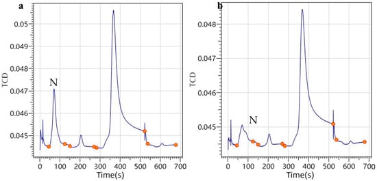In the previous studies, one-stage purging always resulted in excessive nitrogen residue in the sample falling hole, thereby impacting the following measurement of S. So, we designed a two-stage purging to fulfill the simultaneous detection of N and S. Herein, the first stage of purging occurs when the sample enters the sample falling hole of the ball cup; then, the ball cup was rotated to make the sample falling hole face the inlet pipe, isolating it from the outside air. The first stage of purging can reduce the N2 residue in the container to 1% at the highest. Subsequently, the second stage of purging was carried out to remove the residual N. After two stages of purging, N2 residue in the sample-containing chamber can be reduced to <0.01% so as to avoid excessive nitrogen residue. As with the previous studies, helium, a kind of inert gas, was chosen as the purging gas with an appropriate flow rate to ensure that the wrapped sample would not be deformed or damaged. As a result, compared to the previous one-stage purging methods, the two-stage purge design gives the lowest N signal as shown in Figure 1, while effectively eliminating the air introduction into the sample falling hole.