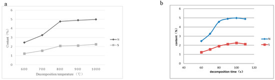 Effect of decomposition temperature and time on N and S contents. The GBW10023 CRMs of nori had a N concentration of 5.0 ± 0.3% and a S concentration of 2.26 ± 0.14%. For Panel (a), it was measured by the TCD using different decomposition temperatures. For Panel (b), it was measured using different decomposition times. Other experimental conditions were performed as per Table 1.