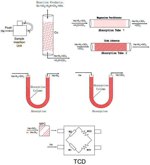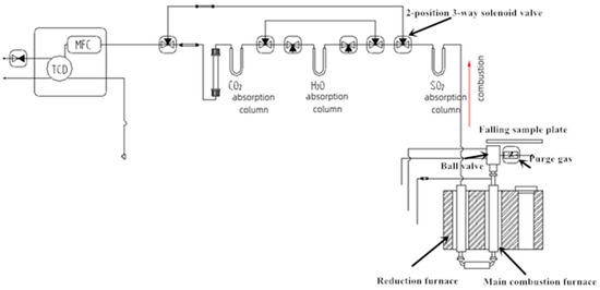 This proposed setup mainly includes a solid sampling system, a gas line unit for controlling high-purity oxygen and helium, a combustion and reduction furnace, a purification column system for moisture, halogen, SO2, and CO2, and a thermal conductivity detector. One single thermal conductivity cell was employed to measure N and S simultaneously, unlike the previous methods that only measure nitrogen or sulfur [5,6,7,8,9,10,11,12,13,14,15,16,20,21,22,23,24,25,26,27,28,29,30,31,32,33,34,35,36,37,38]. To fulfill this goal, two-stage purging was newly designed and the relatively high-temperature decomposition and carrier gases were all optimized herein.