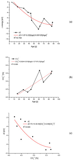 It is obvious that Equations (5)–(10) can be applied exclusively for the same types of chemical compounds and the same type of crystallographic system. The interpretation of the data is that the energy differences cover changes in composition, the occurrence of vacancies, the structural deviations from the ideal positions, the change of orientation leading to smearing of reflexes, and the increased frequencies of oscillations around ideal positions. The studies on real tissues (e.g., enamel, bone) allow for an inclusion of the influence of the texture as well.