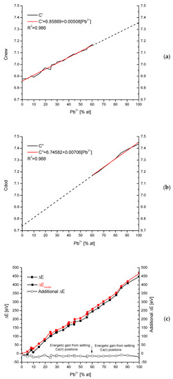 47]. One can assume that the first line approximating the “c” parameter in the zone of lower concentrations of Pb can be prolonged up to transection, with the ordinate for the concentration of 100 at%. The prolongation shows what would happen if it manages to continue the substitution in positions of ions Ca(II) (