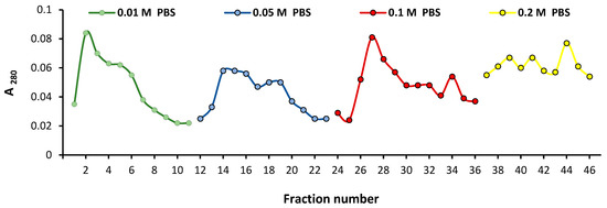 In the first step, a substantial part of the non-specific protein was removed, and an increase of the specific activity to 6800 U/mg of protein (22-fold purification) was achieved. With the DEAE cellulose column, the enzyme was eluted as a single peak with 0.1 M PBS, pH 7.5 (Figure 1). After its concentration, a preparation with a specific activity of 8200 U/mg was obtained. Further purification by ion-exchange chromatography on a Q-Sepharose column in an FPLC system followed by concentration led to an electrophoretically pure enzyme with a specific activity of more than 11,000 U/mg of protein. At this last stage, the enzyme was eluted to the greatest extent with a 70% salt solution in the elution buffer (Figure 2).