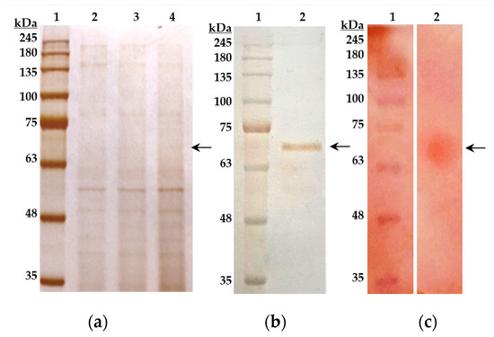 Sialidase of O. paurometabola O129 (marked by arrow), shown by SDS-PAGE in a 10% separating polyacrylamide gel. The enzyme was stained either by silver staining (a,b) or by the use of the Pierce™ Glycoprotein Staining Kit (Thermo Scientific Inc., Waltham, MA, USA), (c). Lanes and samples: (a): 1, molecular weight marker; 2–4, crude enzyme obtained after (NH4)2SO4 precipitation, dialysis, and purification through a DEAE cellulose column; (b): 1, molecular weight marker; 2, entirely purified sialidase of O. paurometabola O129; (c): 1, molecular weight marker; 2, purified sialidase after glycoprotein staining. The characteristic magenta color, which the purified protein acquired as a result of Schiff base staining, reveals the very likely presence of a glycosyl moiety. As a molecular weight marker, we used the PerfectTM Tricolor Protein Ladder (EURx, Gdansk, Poland). The determination of the molecular weight of the purified sialidase was performed by the estimation of the relative mobility factor (Rf). The decimal log value corresponding to this Rf is approximately 70 kDa.