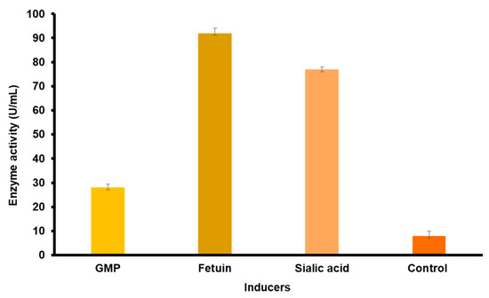 The observation of the effect of different inducers revealed that the highest enzyme activity could be achieved by the addition of fetuin (98 U/mL) and sialic acid (77 U/mL). The addition of GMP to the semisynthetic medium led to more than a 2-fold increase in enzyme activity (27.50 U/mL), as shown in Figure 5.