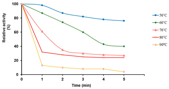 Our results indicated that the O129 sialidase retained 80% of its activity after 5 min at 50 °C. After 3.5 min of heating at 60 °C, the activity was reduced by half, and approximately 30% of it was preserved at 70 °C and 80 °C. There still was some residual activity after the enzyme preparation was heated at 90 °C for 5 min (Figure 6).