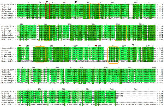 Amino acid sequence alignment of the novel O. paurometabola O129 sialidase (NCBI GenBank accession number OP429228) with the deduced amino acid sequences of the enzymes of O. paurometabola DSM 14281 (WP_204809048.1), O. gallyi strain Sa2CUA8 (WP_191790498.1), O. jenensis (WP_205305555.1), O. turbata (WP_030151436.1), O. enterophila (WP_068625153.1), and M. viridifaciens (WP_089006911.1). Full identity is outlined in dark green, partial identity, in green and light green, and lack of identity, in white. The Y/FRIP motif is enclosed in a red rectangle; the Asp-boxes are enclosed in yellow rectangles. The predicted conserved catalytic residues are marked with inverted triangles—red for the arginine triad R25, R227, R287, white for the glutamate E211 and E330, black for the aspartate D49 and tyrosine Y314.