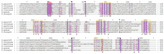 Amino acid sequence alignment of the novel O. paurometabola O129 sialidase (NCBI GenBank accession number OP429228) with the deduced amino acid sequences of the enzymes of V. cholerae (AWB74302.1), C. perfringens (APZ74275.1), A. viscosus (VEI16517.1), Str. pneumoniae (WP_129559156.1), and Tannerella forsythia (CQ24155.1). Full identity is outlined in dark violet, partial identity, in light violet, and lack of identity, in white. The Y/FRIP motif is enclosed in a red rectangle; the Asp-boxes are enclosed in yellow rectangles. The predicted conserved catalytic residues are marked with inverted triangles—red for the arginine triad, white for glutamate, and black for aspartate and tyrosine.