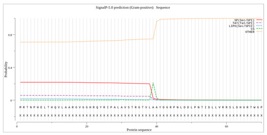 Signal peptide of O. paurometabola O129 sialidase as predicted with high probability by SignalP 5.0 software. The cleavage site LAA is marked by a green peak.