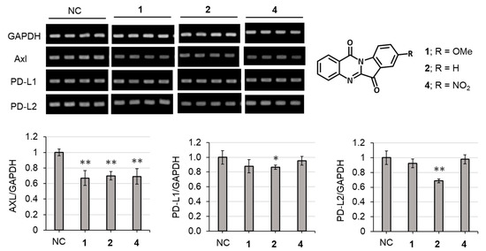 Effect of compounds 1, 2 and 4 on expressions of Axl and immune checkpoint molecules (PD-L1 and PD-L2) in A549 cells. Values indicate means with standard deviation. NC indicates a negative control. Statistical analysis was performed using Fisher’s test (*: p < 0.05, **: p < 0.01 vs. NC, n = 4).