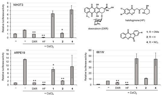 Compounds 1, 2 and 4 were evaluated for HIF inhibitory activity via HIF luciferase assay (Figure 6). CoCl2 was used to induce HIF activation, and halofuginone and doxorubicin were used as positive controls for HIF inhibition. The NIH3T3 cell line was used because it is a widely used cell line for general understanding of the role of HIF and it is easy to develop a HIF-luciferase reporter stable cell line [49]. Compound 2 demonstrated significant inhibitory activity on HIF activation induced by CoCl2 in the cells. We also tested in vitro cell models for ophthalmic drug development such as the ARPE-19 cell line (human retinal pigmented epithelium cells) and 661W cell line (mouse immortalized cone photoreceptor cells with some features of retinal ganglion precursor-like cells) [50,51,52]. In ARPE-19 cells, compounds 1 and 2 demonstrated statistically significant HIF inhibitory effects. These results indicate that compound 2 (tryptanthrin) has the strongest inhibitory effect on HIF-activation among the three compounds.