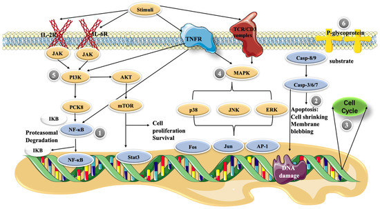 Possible molecular mechanisms of cepharanthine in cells. (1) NF-κB pathway, (2) apoptosis, (3) cell cycle control, (4) MAPK pathway, (5) PI3K/Akt/mTOR signaling pathway, and (6) P-glycoprotein expression.