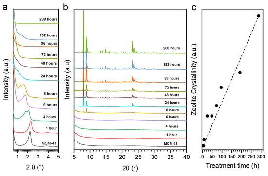 Low angle (a) and wide angle (b) X-ray diffraction patterns of materials after indicated times of SAC treatment and the evolution of zeolite crystallinity as a function of the SAC treatment time (c).