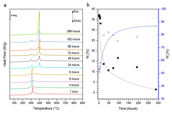 Differential thermogravimetric analysis (DTA) (a) and weight loss (b) for materials after indicated SAC times. The blue and black symbols represent the cumulative weight loss between 120 and 350 °C (W1) and 350 and 900 °C (W2).