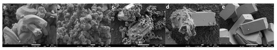 SEM images of parent MCM-41 ((a), length of the scale bars of 1 µm) and for materials achieved after SAC treatment for 8 h ((b), length of the scale bars of 1 µm), 24 h ((c), length of the scale bars of 10 µm), 96 h ((d), length of the scale bars of 1 µm), and 288 h ((e), length of the scale bars of 10 µm).