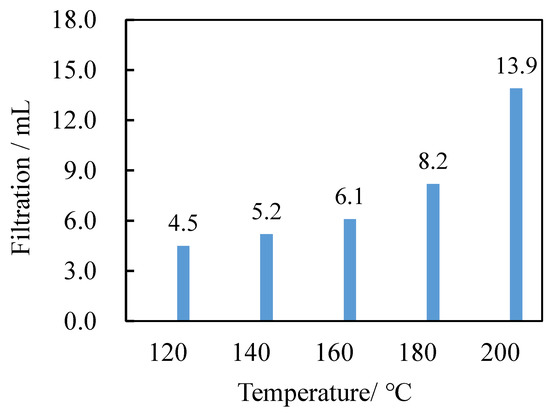 It can be seen from Figure 6 that when the experimental temperature is 120–180 °C, the filter loss does not exceed 12 mL, and the increase of the filter loss is relatively slow with the increase of the temperature. However, when the temperature reaches 200 °C, the filter loss exceeds 12 mL, and the increase trend of the filter loss is stronger than that of the previous filter loss. Therefore, the analysis shows that the filter loss at this temperature is not up to the standard, indicating that the performance of the additive is poor when the temperature is 200 °C, so the temperature resistance of this material can reach 180 °C.