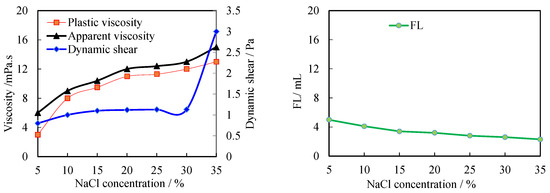Evaluation of salt resistance: 350 mL of freshwater base slurry was measured, a certain amount of NaCl was added, stirred for 5 min at high speed, then 2.0% modified starch was added, stirred for 5 min at high speed, and the medium pressure filtration loss was measured after curing at room temperature for 24 h. The shift in the filtration loss of the modified starch was identified by investigating the increase of NaCl in the freshwater base pulp. The lower the filtration loss, the better.