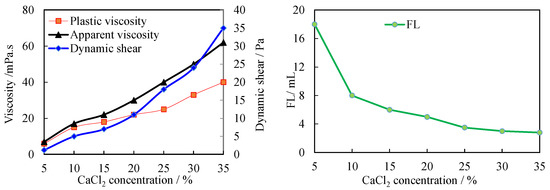 Evaluation method: 350 mL saturated saline base slurry was measured, a certain amount of CaCl2 was added and stirred at high speed for 5 min, then 1.5% modified starch was added and stirred at high speed for 5 min, and the medium pressure filtration loss was measured after curing at room temperature for 24 h. The amount of CaCl2 in the saturated brine slurry was continuously increased and the shift of the filtration loss was measured (Figure 8).