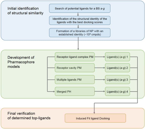As has already been mentioned, the selection and development of low-molecular-weight structures capable of disrupting the interaction of RBD with ACE2 is currently an urgent task. In this study, to search for new potential inhibitors of the SARS-CoV-2 spike RBD binding to ACE2, we propose an integrated approach based on the development of pharmacophore models and the subsequent screening of a database of NPs based on these models. This study consisted of three main blocks with the first one dealing with the initial identification of structural similarity; see Figure 2.
