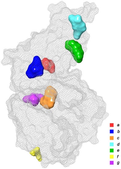At this stage, we conducted a small literature review and tried to summarize the available data on the known in silico investigations of the main binding domains of potential ligands (both natural and synthetic) with the RBD and ACE2 receptors; see Figure 3. In total, about seven basic sites were defined, namely (a)—the RBD–ACE2 binding interface [20,21,22,23,29,40,44,45,46,47,48,49,50,51,52,53,54,55]; (b,e)—three pockets on the surface of the RBD protein near the central contact zone [21,26,46,56,57] and (d)—in the recess of a bended hydrophobic “tube” [24,58,59]; (c)—large catalytic cleft in the cavity of ACE2 [20,25,41,44,45,60,61,62]; (f)—surface binding site ACE2 [20,57]; and finally, (g)—a tight pocket in the core of ACE2 near its cleft [41,63,64,65]. The potential inhibitors of the listed base domains are presented in Table 1, while their residues are described in Table 2.