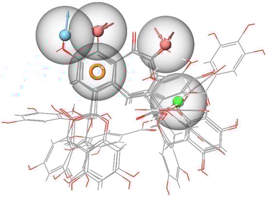 Furthermore, in the framework of this study, we tried to create a merged hypothesis that takes into account the structures of the three hypotheses presented above. As a result of the generation of the merged hypothesis, a model was obtained that includes the common features of the previous three models. It can be seen that, in this case, features, such as A1, D22, D36, N4, R31, R32, R33, and R34, were retained; see Figure 7. In general, here, as well as in the receptor-ligand and receptor cavity models, one can observe the arrangement of a number of aromatic cycles in the Arg493-Ser494-Arg498-His-34 cavity. This indicates the most preferred configuration of the potential ligand for a given binding site.