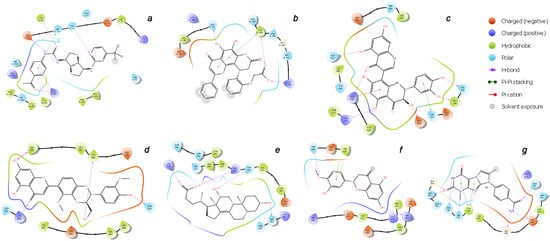 It follows from the data presented in Table 3 that the best ligand in the IFD analysis is not always the one with the highest screening score. This indicates that the flexibility and variability of the protein structure in the region of the binding domain correct the resulting energy of interaction with the ligand during docking. Table 4 shows the final result of the performed IFD calculations in the most ranked binding position arranged in the order of decreasing predicted free binding energy, ΔG. The extensive interactions of the docking poses of the top-ligands with binding domains a–g are shown in Figure 8, while their corresponding 2D interaction diagrams are presented in Figure 9. These contacts include hydrogen bonds (HBs), van der Waals interactions, π-alkyl, and π–π stacking.