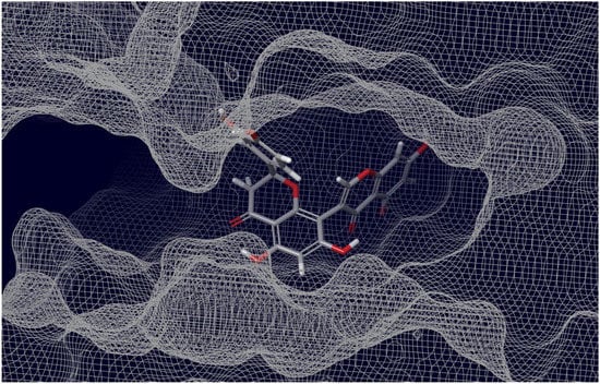 Ligand CNP0393256 is quite well-known [92] and is none other than Hesperetin; it is stabilized at binding site f on the surface of ACE2 primarily by a network of the non-valent π-interactions, as shown in Figure 8f and Figure 9f. In particular, two strong t-stacking contacts are realized between the aromatic system of the methoxyphenol moiety of Hesperetin and both aromatic cycles of the indole moiety of Trp610. Two more π–alkyl interactions are formed between Arg482 and two cycles of Hesperetin. There is also a similar contact with Lys475. Hydrogen bonds are represented by the contacts of Thr608 with the methoxy group and those of His493 with the hydroxy groups of Hesperetin.