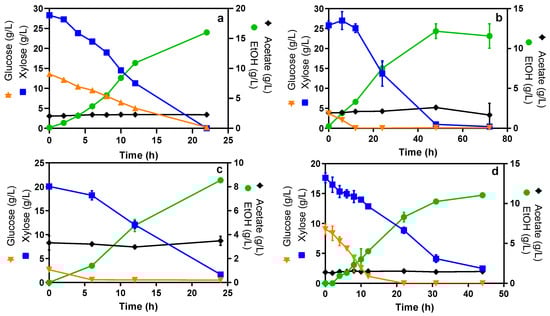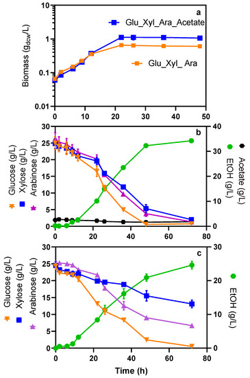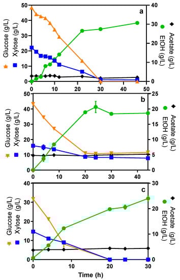Fermentation of hydrolysates from corn stover (Figure 2b) and barley straw (Figure 2c) did not show a clear co-consumption of both monosaccharides because their initial glucose concentrations were under 4 g/L. This issue makes the analysis difficult because, as reported in previous studies, under limited-oxygen conditions, low glucose concentrations trigger high transcriptional levels of ptsG, a gene that is directly involved in catabolic repression, in turn affecting metabolic cellular regulation [27]. In addition, the glucose uptake rate is limited by glucose concentration [28], which explains the lower Qglc for these syrups (Table 2). Meanwhile, similarly to sugar consumption rates, QEtOH seems to be negatively affected by the initial sugar concentration, being 0.5 to 4 times lower than other reports for ethanol production from corn and barley [29,30]. Furthermore, a YEtOH above 80% demonstrates that low glucose concentration affects the kinetics of the process but not the yields.