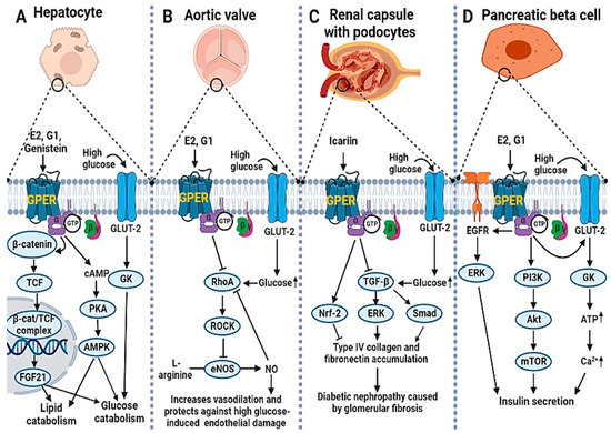 It is noteworthy that elevated levels of estrogens and exposure to exogenous GPER antagonists could contribute to the pathogenesis of DM [26,27,28]. Thus, GPER modulation in physiological and diabetic conditions is complicated and depends on several factors, including sex, age, the extent of GPER expression, and the type as well as concentrations of ligands (agonist or antagonist) that interact with the receptor [17,23,27,29]. The role of GPER in diabetic conditions has been excellently reviewed [15,26,30]. Here we give an overview of the recent advances in the role of GPER signaling in the pathogenesis of DM and attempt to establish new molecular mechanisms and therapeutic targets/options.
