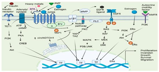Estrogenic effects have been ascribed to the nuclear estrogen receptors (ERα and ERβ), which function as transcription factors binding to the regulatory response elements in the promoters of target genes [86]. However, estrogen also triggers non-genomic, rapid cellular events through a seven-transmembrane GPER referred to as GPR30 [87]. GPER is expressed both in the plasma membrane and in the endoplasmic reticulum [81]. It is involved in the proliferation, migration, chemoresistance, and metastasis of breast cancer [88]. The binding of estrogen and related compounds to GPER activates multiple intracellular signaling pathways, including the MAPK, adenylyl cyclase, and PI3K signaling pathways through transactivation of the (EGFR) [89]. Therefore, GPER is required for EGFR and ERK activation by epidermal growth factor [90]. It is noteworthy that GPER nongenomic signaling events can result in long-term transcriptional changes and a broad range of responses among a variety of cell types [59].