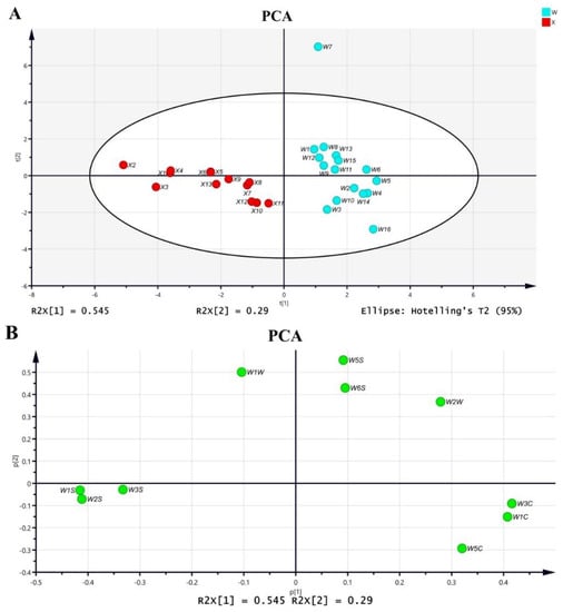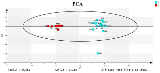 PCA classification results of Acanthopanacis Cortex (W) and Periplocae Cortex (X) based on GC-MS data.