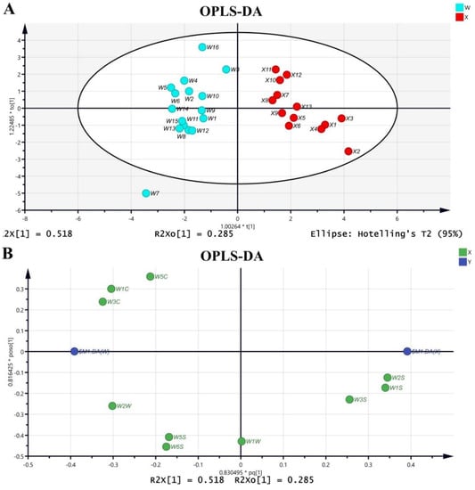 As an unsupervised analysis method, PCA analysis only reflects the original state of the data and observes the natural distribution and group relationship of the test samples, but it cannot ignore intra-group errors, eliminate random errors irrelevant to the research purpose, or ignore the overall characteristics and change rules of the data, which is not conducive to finding the differences between groups and the metabolites of differences. In order to determine the chemical differences between Acanthopanacis Cortex and Periplocae Cortex, the data were further analyzed by supervised OPLS-DA analysis. OPLS-DA was used to assess and maximize the differences between the two groups. The OPLS-DA score plot and loading plot are shown in Figure 2. An obvious separation trend between the two groups was observed in the OPLS-DA score plot (Figure 2A), which proved that the model was successfully established. At the same time, the model parameters R2X = 0.804, R2Y = 1, Q2 = 0.844 in the model indicated that the model had a good fitness and prediction. As shown in the OPLS-DA loading plot (Figure 2B), the Periplocae Cortex samples that clustered at the right side of the biplot showed a stronger association with W1S, W2S and W3S.