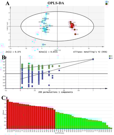 OPLS-DA model of Acanthopanacis Cortex (W) and Periplocae Cortex (X) based on GC-MS data. (A) OPLS-DA model; (B) 200 permutation tests; (C) identification of key VOCs by OPLS-VIP. The horizontal coordinate number was corresponding to Table 1; red indicated volatile aroma compounds with VIP value greater than 1; green indicated volatile aroma compounds with VIP value less than 1.