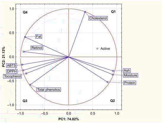 The visualisation of original variables in the two principal components (PC1 × PC2) arrangement is presented in Figure 1. PC1 was positively related to ash, moisture, and protein content, and negatively influenced by ABTS, DPPH, retinol, fat, α-tocopherol, and total phenolics. PC2 was positively related to cholesterol concentration. The coefficients for these correlations are given in detail in Table 4.