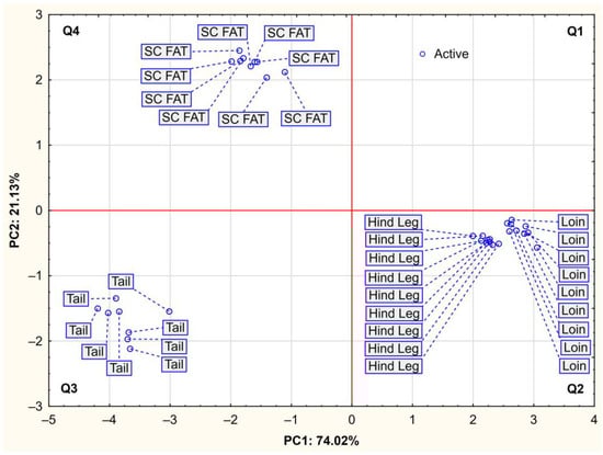The positioning of chemical compounds and indices of the total antioxidant capacity plotted for cases by principal component analysis represented their importance in individual tissues, from which three groupings can be distinguished (Figure 2). Three variables of proximate composition (moisture, ash, and protein content), that were positively correlated with PC1, are placed on the right side of Figure 1 and are representative for skeletal muscles (from loin and hind leg) shown in Figure 2. In turn, ABTS, DPPH, retinol, fat, α-tocopherol, and TPC (the variables negatively correlated with PC1) represent the clearest illustration of the antioxidant potential of tissue from the tail, which is located in the lower left quadrant (Q3, Figure 2). Furthermore, retinol and fat contents were negatively correlated with PC1, corresponding to a combined area of quadrant 3 and 4, in which cases of tissues with the highest content of these compounds (Table 2), i.e., tail (Q3) and subcutaneous fat (Q4) were located. Principal component 2 was most positively correlated with cholesterol content (Figure 1), and the area of this relationship included quadrants 1 and 4, in which cases of subcutaneous fat (Q4) were distributed (Figure 2). In general, the spatial location of individual beaver tissues in the PC1 × PC2 coordinate system proves their mutual variation considering proximate composition and antioxidant potential.