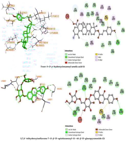 Furthermore, the compound trans−3−O−p−hydroxycinnamoyl ursolic acid (1) was considered the best-docked compound compared with the reference compound based on its low binding affinity (−9.237 kcal/mol), hydrogen bond formation with important amino acid Val882 (with a distance of 2.45 Å) and hydrophobic interactions with various amino acid residues with the target protein binding pocket, including MET804, LYS833, LYS808, ILE831, MET953, ILE963, PRO810, LYS890, and ALA805. On the other hand, other selected compounds have no higher binding affinity than the reference compound. Therefore, compound 1 deserves further testing to confirm its mode of action (Table 1).