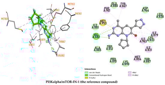The achieved docking results for the complexes of the studied compound and reference compound (PI3Kalpha/mTOR-IN-1) with PI3Kα/mTOR the target protein.