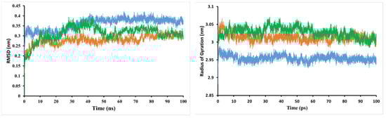 The radius of gyration (Rg) was also used to evaluate the compactness of the protein–ligand complex [20,21]. When a ligand is bound, Rg can predict how the protein will unfold and fold. A high Rg value indicates that the protein–ligand association is not unfolded (less tight). The mean Rg value of the PI3K/mTOR complex with compound 1 was in the range of 2.88–2.99 nm, while between 2.98–3.07 nm for the reference compound. This implies that the PI3K/mTOR complex with the low Rg-valued compound 1 inhibitors shows less disorder/entropy than the PI3K/mTOR complex with the reference compound. The mean Rg value of the PI3K/mTOR complex with compound 2 was in the range of 2.98–3.06 nm.