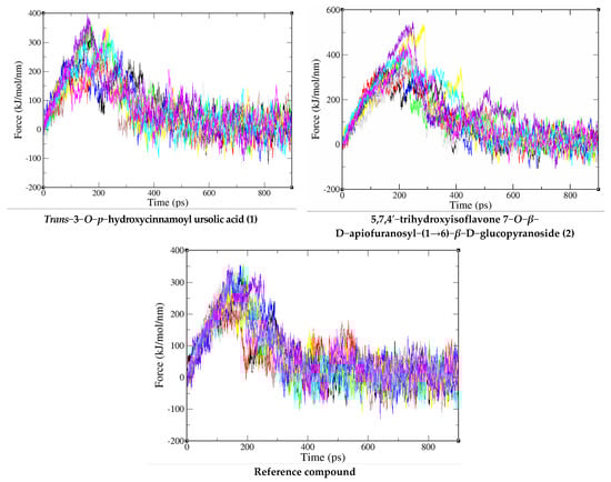 Through the SMD simulation, the profiles of pulling force over simulation time are shown in Figure 4 and Table 2. The pulling work spent on the co-crystallized ligand from the binding site of PI3K/mTOR was 72.0 ± 6.7 kcal/mol and Fmax = 331.4 ± 30.4 pN. While the compound trans−3−O−p−hydroxycinnamoyl ursolic acid has W = 83.5 ± 10.6 kcal/mol and Fmax = 336.2 ± 45.3 pN, compound 5,7,4′−trihydroxyisoflavone 7−O−β−D−apiofuranosyl−(1→6)−β−D−glucopyranoside has 126.6 ± 21.7 kcal/mol and Fmax = 430.3 ± 84.0 pN, which are higher than that of the reference compound. According to equation 2, we can estimate the non-equilibrium binding free energy ∆GneqJar = ΔG(tend) [22], which is equal to −66.89196, −69.86074 and −101.2317 kcal/mol for the reference compound—corresponding to PI3K/mTOR, trans−3−O−p−hydroxycinnamoyl ursolic acid, PI3K/mTOR and 5,7,4′−trihydroxyisoflavone 7−O−β−D−apiofuranosyl−(1→6)−β−D−glucopyranoside, and PI3K/mTOR complex, respectively. Since the pulling speed is substantially faster than that used in the experiment, ∆GneqJar has a very large value [23]. In the error bars, the Fmax and W of the selected compounds are larger than the reference compound, indicating that trans−3−O−p−hydroxycinnamoyl ursolic acid and 5,7,4′−trihydroxyisoflavone 7−O−β−D−apiofuranosyl−(1→6)−β−D−glucopyranoside binds PI3K/mTOR more strongly than the reference compound.