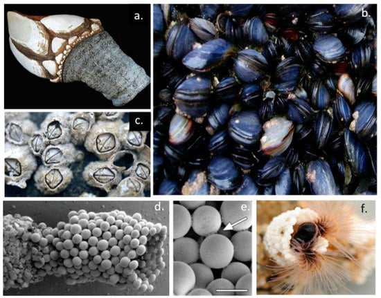 Some marine organisms that secrete adhesive proteins that they use to adhere to rocks and other marine surfaces. Gooseneck barnacle Pollicipes pollicipes (a), blue mussel Mytilus edulis (b), Acorn barnacle Chthamalus stellatus (c), and the sabellariid polychaete Sandcastle worm Phragmatopoma californica, showing the detailed assembly of its tube-like structures using micro glass beads supplied in the laboratory rather than the sand particles used in nature (d), intricate point adhesions used to cement glass beads togethor are labelled with small white arrow, scale bar 100 μm (e) and a sandworm inhabiting a tube (f). Images a–d from Wikipedia Commons under Open Access Creative Commons Attribution-Share Alike 4.0 International licence, © Hans Hillewaert 2006. Images d–f reprinted with permission from Ref [1] under Open Access.
